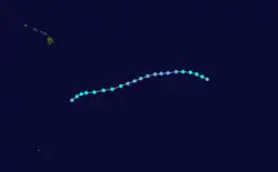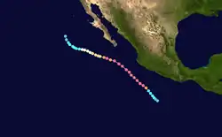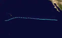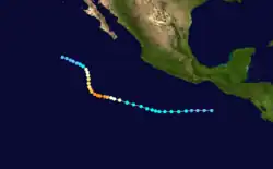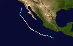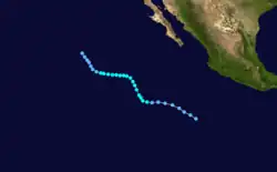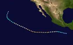 During the 1983 season, a total of 21 named storms formed,[3] which was well-above the long-term average of 15.[4] However, this total was slightly less active than the 1982 Pacific hurricane season, which saw a then-record 22 storms form.[5][6] However, 1983 was at that time the most active season in the Eastern Pacific Hurricane Center (EPHC) warning zone,[7] but this record itself was surpassed during the 1985 Pacific hurricane season,[8] and again in the 1992 Pacific hurricane season.[9] Additionally, 12 storms reached hurricane intensity, which was above the average of eight.[7] Of the 12 hurricanes, eight attained Category 3 intensity or higher on the SSHWS.[4] The season started on May 21 with the formation of Adolph and ended on December 9, with the dissipation of Hurricane Winnie. Lasting 201 days, 1983 was the longest season on record. There were a total of 1,238 storm hours, which was the most in four years.[7] Despite the activity in the EPHC's warning responsibility, only two storms formed in the Central Pacific Hurricane Center (CPHC)'s area of responsibility, both of which stayed depressions.[10] A moderate El Niño was present throughout the season, with water temperatures across the equatorial Central Pacific was nearly 5 °F (0.6 °C) above normal.[11] The Pacific decadal oscillation (PDO) was in a warm phase during this time period.[12] Both of these factors are known to enhance Pacific hurricane season activity. Furthermore, 1983 was in the middle of an era where all but the 1988 Pacific hurricane season was near or above average.[13]