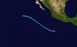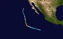The origins of Hurricane Ismael were from a northward bulge of the Intertropical Convergence Zone (ITCZ) in early August, which resulted in the formation of a tropical depression on August 8. Six hours later, it was upgraded into Tropical storm Ismael. Continuing to intensity, Ismael was upgraded into a hurricane late on August 10 and subsequently developed an eye. The storm soon reached its peak of 100 mph (155 km/h). Late on August 11, Hurricane Ismael began to weaken as it encountered cooler waters and the hurricane was soon downgraded to a Category 1 on the SSHWS. The following day, Ismael was downgraded into a tropical storm about 380 mi (610 km) west of the Baja California peninsula. On August 14, the storm was downgraded into a tropical depression while centered about 250 mi (400 km) west of Point Ensenada.[7] Ismael dissipated that day.[3]