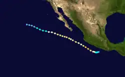 The eleventh cyclone of the 1983 season formed from an intense area of thunderstorms located over the Yucatán Peninsula on August 11 and 12. After crossing the Mexican mainland, it emerged into the Pacific basin near Guadalajara early on August 13. After turning northwest, it intensified into a depression two days later after showing sign of a circulation. The depression continued northwest with little change in wind speed, and on August 16, about 24 hours after formation, the depression dissipated after its circulation ceased very close to landfall on the Baja California peninsula.[7]