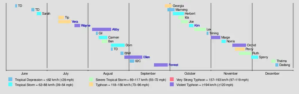 The season had a late start, as the first system did not form until early June for the first time since 1973.[1] The last tropical cyclone dissipated in mid-December. Of the 23 tropical storms, one formed in June, three formed in July, five formed in August, two formed in September, six formed in October, five formed in November, and one formed in December. Ten storms reached typhoon intensity according to the Japan Meteorological Agency, of which four reached super typhoon strength. Fifteen of the tropical cyclones made landfall, with six moving through the Philippines, six striking China, six moving into Vietnam, and three moving in Japan. Vera, Wayne, Kim, and Lex led to over half of the fatalities from tropical cyclones this season. Forrest became the fastest-developing tropical cyclone on record for the western Pacific Ocean, with a pressure drop of 92 hectopascals (2.7 inHg) in a 24‑hour period.[1]