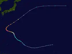 First noted southeast of Guam on July 31, this system slowly matured into the season's second super typhoon as it moved west-northwest over the following nine days. Intensification was most rapid as it was slowly recurving northward on August 7 and August 8. After peaking early on August 9, Abby slowly weakened as it interacted with the main belt of the Westerlies. It managed to remain a major typhoon, with winds at or above 100 knots (190 km/h), for a week. Abby finally weakened back into a tropical storm on August 17 just before its landfall at Hamamatsu, Japan. By late that night, Abby completed the transition to an extratropical cyclone after moving through central Japan. Two perished from Abby in Japan. Its deluge led to numerous landslides and the destruction of 19 bridges. Commercial traffic by land, sea, and air was also paralyzed by the cyclone.[13]