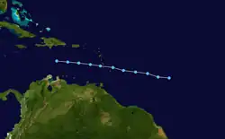 A tropical depression formed about 800 mi (1,285 km) east of the Windward Islands on July 24. Moving west-northwestward, the depression passed between Martinique and Saint Lucia early on the following day.[20] On the latter, the storm dropped up to 8 in (200 mm) of precipitation. The Castries River overflowed its banks, washing away three homes in the eastern section of Castries. Two commercial fisherman were reported missing.[24] Barbados recorded up to 6 in (150 mm) of rainfall in association with the system.[25] The depression entered the Caribbean Sea and failed to intensify further, dissipating about halfway between the Dominican Republic and Venezuela late on July 26.[20]