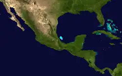 An upper-level low-pressure area traversing the southern Gulf of Mexico spawned convective activity over the Isthmus of Tehuantepec on June 16. This convective area waxed and waned somewhat in intensity, until becoming a larger disturbance on June 18. A surface low soon formed,[23] and around 12:00 UTC that day, the system developed into a tropical depression over the Bay of Campeche.[20] With vertical wind shear preventing significant further intensification,[23] the depression made landfall near Tampico, Tamaulipas, with winds of 35 mph (55 km/h). The depression quickly dissipated over the mountainous terrain of eastern Mexico.[20] The cyclone and its precursor dropped heavy rainfall in some areas, including a peak total of 11.43 in (290 mm) of precipitation in San Lucas Ojitlán, Oaxaca.[23]