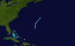 A well-defined tropical wave emerged into the Atlantic from the west coast of Africa on August 23. Moving westward and later northwestward, the system remained to the south of a persistent shearing pattern that inhibited the development of several tropical waves. A reconnaissance aircraft flight indicated that a tropical depression formed late on August 28 roughly 700 mi (1,100 km) east of Trinidad. On the next day, another reconnaissance flight recorded tropical storm conditions, and thus, the depression intensified into Tropical Storm Arthur. The cyclone attained its peak intensity several hours later with maximum sustained winds of 50 mph (85 km/h) and a minimum barometric pressure of 1,004 mbar (29.6 inHg). Arthur was downgraded to a depression on September 1 after being negatively impacted by vertical wind shear, and dissipated on September 5 about halfway between the Bahamas and Bermuda. Despite its close proximity to the Lesser Antilles, Arthur caused no significant impact on land as it was a tropical depression at the time.[28]