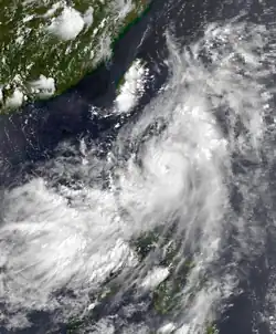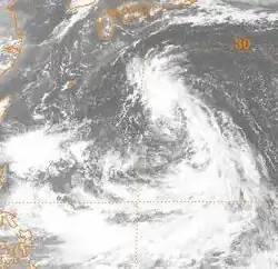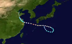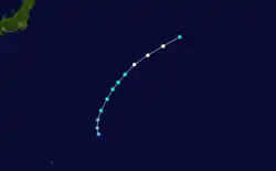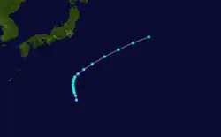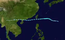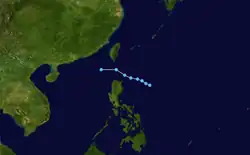 Development of this system was slow within the eastern portion of the monsoon trough. By midday on July 2, the disturbance was first noted about 1,020 kilometres (630 mi) southwest of Guam. The system moved northwest for much of its life cycle, initially following Alex and then the southwest side of the subtropical ridge. A broad tropical depression formed on the afternoon on July 5 within the disturbed weather area, weakening as it passed over Luzon. Late on July 7, ship reports indicated the system had become a tropical storm. The cyclone moved within the radar fence of Hong Kong near its peak intensity before making landfall 250 kilometres (160 mi) to its west-southwest during the early afternoon of July 9. Winds gusted to 70 knots (130 km/h) at Green Island.[1] Weakening over the topography of China was rapid thereafter, and the system dissipated by early on July 10.[6]
