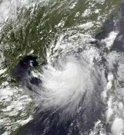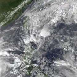 A surface low formed within the monsoon trough on August 25. The low drifted westward as convection tried to consolidate around the center. Strong upper level wind shear inhibited development for the next couple of days. It took until late on August 28 for a single circulation center to consolidate, and when it did, gale-force winds around the center forced an upgrade from a monsoon depression to a tropical storm about 200 kilometres (120 mi) east of Luzon. Moving westward, it struck Luzon early on August 29. By late morning, the system turned west-northwest over the mountainous island, emerging into the South China Sea. A total of 121 lives were taken by June across the Philippines,[17] and damage totaled US$5 million (1984 dollars.)[1] A weakness in the subtropical ridge to its north led to a turn to the northwest, and the system made landfall 240 kilometres (150 mi) east of Hong Kong. Winds gusted to 38 knots (70 km/h) at Tate's Cairn, and total rainfall at Cheung Chau reached 187.3 millimetres (7.37 in).[1] When Tropical Storm June hit southeast China on August 30, 67 people were reported dead due to extensive flooding from June's broad circulation.[18]