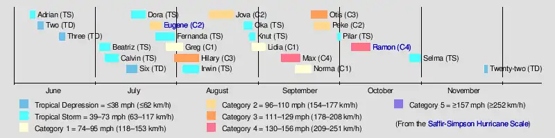 Only one tropical storm developed in June. In July, six named storms formed. Out of these storms, Hilary was the only storm to reach major hurricane status.[3] The month of August had a total of five named storms, four of which became hurricanes. However, August did not feature any major hurricanes, though Hurricane Jova came close, peaking as a moderate Category 2. The month of September held the same number of named storms as August, with five named storms.[3] The month also was the carrier of the strongest hurricane on record at that time (that had its intensity estimated from satellite imagery), Hurricane Max, a strong Category 4 hurricane. Hurricane Norma was a Category 1 hurricane on the Saffir–Simpson scale, which dissipated to the south of the Baja California Peninsula.[5] The month of October featured only two tropical cyclones. The first system, Ramon, was a Category 4 hurricane.[3]