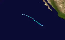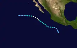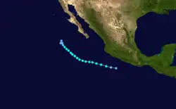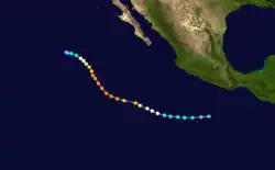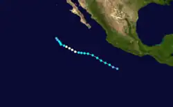Otis originated from the a tropical disturbance embedded in the monsoon trough. It moved over the warm waters south of the Mexican Riviera from September 17 to September 19. At 0000 UTC September 20, the disturbance was upgraded into Tropical Depression Nineteen-E while moving to the northwest.[5] It strengthened into a tropical storm later that day while located 950 mi (1,530 km) southwest of La Paz.[3] Eighteen hours later on September 21, Otis intensified into a hurricane.[5] It also began to turn back to the west and began to undergo a period of rapid deepening. On September 22, Otis reached its peak windspeed of 115 mph (185 km/h).[5] It would oscillate irregularly between that strength and Category 2 intensity until September 24.[3] That day, it began accelerating to the west as it lost strength due to increased wind shear and decreasing ocean temperature.[5] Otis fell to tropical storm strength on September 25 and a depression on September 26, and dissipated shortly after that.[3]