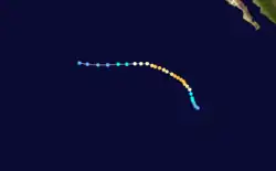 Lidia originated from a disturbance that entered the basin on August 28. It remained south of the Mexican coast in an area of warm sea surface temperatures, and at 1800 UTC August 29, Tropical Depression Fifteen formed.[5] It intensified into a tropical storm six hours after development about 860 mi (1,385 km) away from Baja California Sur. Lidia moved northwest, paralleling the Mexican coast. It edged in a more westerly direction for a day before resuming its northwesterly path, and reached hurricane intensity on 0600 UTC September 1.[3] At its strongest on September 1 based on intensity estimates via Dvorak classifications, Hurricane Lidia had a wind speed of 85 mph (135 km/h).[5] Shortly thereafter, Lidia began weakening and lost hurricane intensity on September 2.[3] Lidia weakened very rapidly over cold water.[5] Early the next day, Lidia weakened to a tropical depression[3] and dissipated over 76 °F (24 °C) waters on 1200 UTC September 3.[5] The remnants of the storm; however, brought showers to California.[24] One woman was injured by a lightning strike.[25]