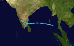 During January 14, the JTWC started to monitor an area of convection that had developed within the near equatorial trough of low pressure, about 900 km (560 mi) to the southeast of Colombo, Sri Lanka.[3][7][8] Over the next couple of days the disturbance moved towards the northwest under the subtropical ridge of pressure, before early on January 17, the JTWC noticed a steady increase in deep convection and issued a Tropical Cyclone Formation Alert.[3] Later that day the JTWC initiated advisories as the disturbance had intensified into a tropical storm and designated it as Cyclone 01A.[3][7] As the Cyclone was suffering from being in an area of strong vertical wind shear it was not able to intensify past minimal tropical storm strength of 65 km/h, (40 mph).[3][7] During the next couple of days, strong upper-level winds stripped deep convection away from the center with the JTWC downgrading the cyclone to a tropical depression early on January 19.[3] The remaining low level circulation center slowly dissipated with the JTWC issuing their final advisory early the next day.[3]
