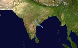During July 27, a depression developed over the northern Bay of Bengal to the east of the Indian state of Odisha.[2][4] Over the next day the system moved westwards and developed into a Deep Depression, as it made landfall near Badudebpur in Odisha with estimated winds of 55 km/h (35 mph).[4] The system dissipated over East Rajasthan during July 31, as it enhanced monsoon activities over northern and eastern India.[4]