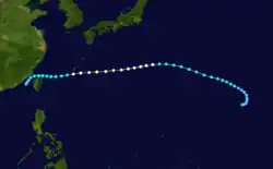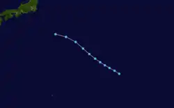 On March 17, a cluster of thunderstorms grouped together which formed a low pressure area far east of the Mariana islands. The low pressure area rapidly intensified and became a tropical storm 4 days after formation. Favorable conditions allowed the system to continue to intensify into a Category 1 typhoon. High wind shear on March 25 caused the system to weakened, and it transitioned into an extratropical cyclone.