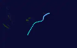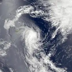 Tropical Cyclone 08P was first noted as a tropical depression by the FMS during January 1, while it was located about 500 km (310 mi) to the east of Alofi in Niue.[18] During that day the depression moved eastwards, before the NPMOC initiated advisories on the system and designated it as Tropical Cyclone 08P.[7][18] During that day 08P started to move towards the southeast through the Cook Islands, before it peaked with estimated 1-minute sustained wind speeds of 85 km/h (50 mph).[7] During January 3, 08P rapidly degenerated into an extratropical low, while it was located about 405 km to the southeast of Papeete in French Polynesia.[18] There were no reports of any impacts within the Cook Islands associated with 08P.[18] Tropical Cyclone 09P developed on January 11, while it was located about 610 km (380 mi) to the north of the island of Tahiti in French Polynesia.[7][19] Over the next couple of days the system moved westwards and gradually turned and started to move south-eastwards before it was last noted during January 14.[7][19]