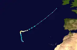 Thereafter, Charley turned eastward and then east-northeastward while tracking over decreasing sea surface temperatures (SST). Early on September 27, Charley was downgraded to a tropical storm. Later that day, Charley crossed over Terceira Island in the Azores with winds of 65 mph (105 km/h). Charley gradually lost tropical characteristics, and by 1800 UTC on September 27, it had transitioned into an extratropical storm.[56] The remnant system accelerated northeastward toward the British Isles, where it merged with another extratropical low on September 29. While passing through the Azores, Charley produced tropical storm force winds, with the Lajes AFB reporting sustained winds of 53 mph (85 km/h) and gusts reaching 82 mph (132 km/h). No other effects from Charley were reported in the Azores.[57]