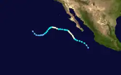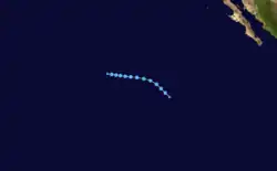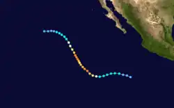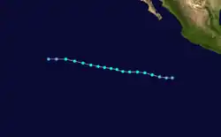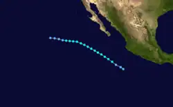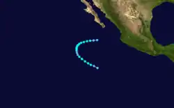 On May 26, a tropical wave moved off the Central America, which began to show signs of organization on May 29.[8] Early on June 1, the NHC classified it as a tropical depression while located 460 mi (740 km) southwest of Acapulco.[8] Based on a combination of ship data and Dvorak intensity estimates, the system was upgraded into Tropical Storm Agatha on June 2.[9] Agatha steered toward the north[8] while steadily intensifying. Around 1800 UTC June 2, the storm peaked in intensity with winds of 70 mph (110 km/h) and a minimum pressure of 990 mbar (990 hPa; 29 inHg).[6] Maintaining its peak intensity for 30 hours, Agatha gradually decelerated as it passed within 100 mi (160 km) southwest of the Mexican coast.[8] The center of the storm promptly became less defined on June 3, simultaneously recurving to the west.[10] By 06:00 UTC June 5, the storm was downgraded back into tropical depression status prior to dissipating the next day.[8]