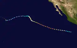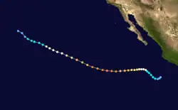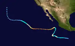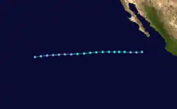 During the season, twenty-seven tropical cyclones formed in the Eastern Pacific (east of longitude 140°W), and twenty-four developed further and became tropical storms. Both of these figures constitute records in the basin, as the 1992 season surpassed the season with the most tropical cyclones (1982, 26) and the season with the most named storms (1985, 22). Of these, fourteen reached hurricane strength and eight became major hurricanes—storms that reach Category 3 or higher on the Saffir-Simpson Hurricane Scale.[5]