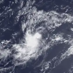 The origins of Hurricane Estelle were from a tropical wave that began on June 23 off the African coast.[29] After passing over northern South America, a large area of disturbed weather formed about 460 mi (740 km) west of Acapulco on July 9 and was classified as a tropical depression two days later. Eighteen hours later, the depression strengthened into Tropical Storm Estelle[29] as banding features increased.[30] Gradually intensifying, the storm's outflow improved,[31] and a burst of deep convection occurred over the center.[32] Early on July 10, an eye developed, and based on this, Estelle was upgraded into a hurricane. Around that time, Estelle turned to the northwest.[29]