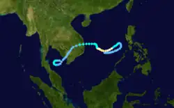 In Vietnam, at least 21 people died and while 80 were reported missing.[15] Intense winds uprooted over 500 trees, downed electrical cables and damaged about 140 houses in Hanoi. As a result of the storm, in the capital alone, three people were killed while another three were injured. Massive waves engulfed several coastal fishing villages in Cát Hải district, with seven people being missing there.[17] Elsewhere, in Hainan, one person died.[16] In the Philippines, combined with the effects of nearby Bobbie, heavy rainfall would produce mudflows in the Philippines. These poured down the Bucao, Balinquero and Maraunot rivers, causing them to rise up 6 ft (1.8 m).[12] Economic losses in Hainan are estimated at 223 million RMB (US$40.5 million).[18]