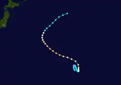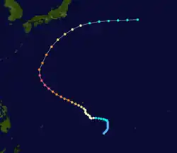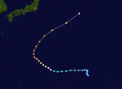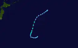Early the next day, Bobbie intensified into a severe tropical storm.[9] At that time, the JTWC claimed that Bobbie had intensified into a typhoon,[9] while the JMA noted that Bobbie had actually became a typhoon several hours later.[5] On 18:00 UTC on 26 June, Bobbie peaked with 1-minute sustained winds of 140 mph (220 km/h) as it tracked the western extent of the mid-level subtropical ridge.[9] Several hours later, Bobbie peaked with 10-minute sustained winds of 105 mph (165 km/h).[5] As Bobbie began recurving east of Taiwan at 12:00 UTC that day, increasing southwesterly winds caused Bobbie to steadily weaken. Passing over Miyako Jima on 28 June and then just southeast of Okinawa on 29 June, Bobbie began undergoing an extratropical transition on at that time.[9] At that time, Bobbie weakened into a severe tropical storm as it left the PAR, causing PAGASA to stop issuing advisories on the storm.[9] As Bobbie transitioned into an extratropical storm, the JTWC issued their final warning on the system the next day, prior to it brushing the southern tip of Honshu.[9] The JMA noted that Bobbie became extratropical early the next day, prior to it dissipating on 3 July.[5]
