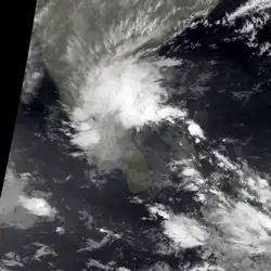 Along the northwest coast of Sri Lanka, the cyclone's flow produced a .5 m (1.6 ft) storm surge.[12] The IMD issued hourly warnings for southern India in advance of the cyclone, through electronic and print media. Around 40,000 people evacuated their houses near the coast.[2] Across southern India, the cyclone killed 70 people and left US$216 million in damage (1993 USD).[13][14] Heavy rainfall reached over 300 mm (12 in) in southern Andhra Pradesh,[2] causing landslides and flooding. The Sathanur Dam exceeded its capacity, forcing hundreds of people to leave their homes in Pondicherry.[13] A 3 to 4 m (9.8 to 13.1 ft) storm surge flooded 60 coastal villages, and waters reached 22 km (14 mi) inland. Around 12,000 people had to be rescued from inaccessible areas after the cyclone struck.[2][13] Train service was halted in and out of Chennai.[14] Roadways across Tamil Nadu were damaged or blocked by fallen trees, after high winds uprooted hundreds of trees and snapped power lines.[15] Hundreds of thousands of people in southern India were left without power or water service. The cyclone also damaged over 44,000 houses, of which 20,000 were in Pondicherry alone, where about 68,000 people were displaced. Knee-deep waters ruined 41,520 ha (102,600 acres) of crop fields.[14]