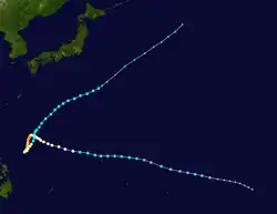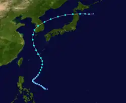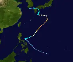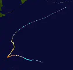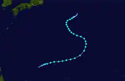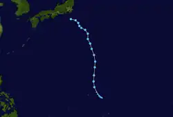 Page moved on a northwestward track for the next couple days while slowly strengthening.[11] Page was upgraded to a tropical storm by the JTWC late on May 12,[12] when it was located 500 kilometres (310 mi) north of Yap,[4] while the JMA first considered the system a tropical storm on May 13.[7] Late on May 13, Page suddenly slowed in forward speed and began turning to the northeast. On May 14, Page became a typhoon.[11][12] However, the JMA did not follow suit until 30 hours later.[7] Page reached its maximum intensity of 90 knots (170 km/h) and minimum pressure of 965 hectopascals (28.5 inHg) thirty hours after passing the point of recurvature.[11] Final warnings were issued by both the JTWC[11] and the JMA[7] early on May 18, as it began extratropical transition around 960 kilometres (600 mi) east-southeast of Tokyo.[11]