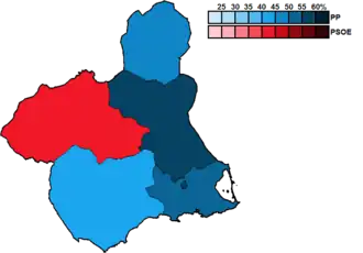 The regional election resulted in the PP consolidating its gains, winning by a landslide as the vote for the ruling PSOE plummeted.[7] PP leader Ramón Luis Valcárcel would become the new President of the Region of Murcia,[8] with the PP remaining in government ever since. The PP would also remain the prime party of Murcian politics until 2019.