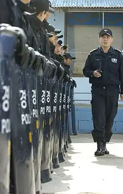 After a single day, the strikes started spreading to other sectors including hospitals.[3] On December 28, South Korean riot police used methods such as tear gas against the strikers in order to dispel crowds. Strikers responded by throwing bricks.[4]