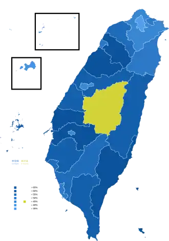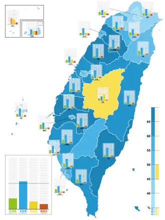 | Lienchiang County | 3,895 | 356 | 13.56% | 1,221 | 46.51% | 35 | 1.33% | 1,013 | 38.59% | 53 | 68.75% | 1,186 |