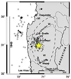 Punitaqui was practically demolished by the quake, where the Mercalli intensity was VII.[2] Damage ranged from as far north as the Antofagasta Region to the southern Araucanía Region.