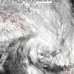 On February 17, the FMS reported that a weak tropical depression, had developed within a monsoon trough over the southern Fijian islands.[6] During that day, the depression moved slowly towards the east before it started to turn towards the southeast during the next day while convection started to organize further.[6] Later that day, the FMS issued a marine weather bulletin, warning that the depression had 10-minute sustained windspeeds of 75 km/h (45 mph).[6] However, the depression was not classified as a tropical cyclone as the gale-force windspeeds were only present in the southern semicircle because of a pressure gradient with a surface ridge of high pressure to the south of the system.[A 2][6] Over the next couple of days the depression moved towards the southeast before it was last noted by the FMS, during February 19 as it approached MetService's area of responsibility.[6]