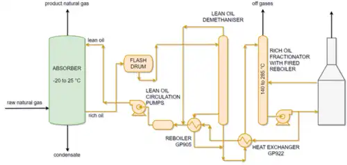 Coupled with the absorbers was a system of columns, pumps and heat exchangers used to regenerate the lean oil from the rich oil stream by separating from it heavier gas components the oil had stripped from the natural gas in the absorbers.[9][10]