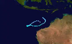 On 3 December, an area of concentrated convection developed from a monsoon trough over the Indian Ocean. The next day RSMC La Reunion issued one advisory on this system, labeling it "A3". Over the next few days the area drifted eastward into the Australian region and slowly organized. The warning center at Perth initiated bulletins on the tropical low on 7 December when the system was located 175 nm west-northwest of Cocos Island. The low remained essentially stationary for the next 48 hours while slowly weakening. Perth discontinued bulletins on the 8th, but continued to track the low for the next few days. The remnants of the low drifted eastward to a point about 150 nm north-northwest of Cocos. There is a significant possibility that this low is the same persistent one that developed into Tropical Cyclone Cathy.[2]