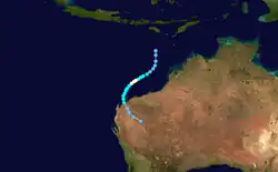 Billy formed on 1 December 1998 off the northwestern Australia coast. The storm moved nearly due south before making landfall near Onslow, Western Australia.[3] Damage estimates from Australia are unavailable.