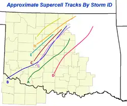 Approximate tracks of the supercells during the outbreak. The supercell that spawned the F5 tornado is marked "A" in green.