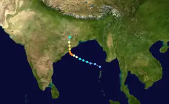 The 1999 East India Cyclone (IMD designated BOB 05,[1] JTWC designated 04B), was the second strongest, deadliest, and costliest cyclone of the 1999 North Indian Ocean cyclone season. On October 15, a developing area of low pressure, located 220 nm northwest of the Andaman Islands began to intensify. By 1730Z a TCFA was issued and the first advisory on Tropical Storm 04B was issued at 2100Z. 04B was moving to the west-northwest at 8–12 knots as it continued to intensify. On October 17, the storm began to turn to a more northerly direction as it intensified to a cyclone. 04B underwent explosive intensification the same day and reached its peak of 140 mph at 0000Z. The storm held this intensity as it made landfall on the Odisha coastline near Gopalpur beach at around 8am.[2] The storm began to weaken due to the interaction with land and dissipated on October 19. 04B was responsible for at least 180 fatalities and hundreds of houses and huts in low-lying areas were destroyed by flooding.[1] Several thousand others were injured by the storm and hundreds were left homeless. The Prime Minister of India requested that relief supplies be distributed to the affected region immediately.[3]