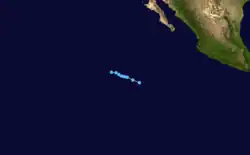 A tropical wave moved off the coast of western Africa into the Atlantic Ocean on August 29. It continued to move westward through the tropical waters of the Atlantic into the Caribbean. It still remained a tropical wave as it moved over Central America and began to acquire more convection and organization, from September 10 through September 11. Visible satellite imagery showed low level circulation and more organized deep convection as it became a tropical depression on September 17, while located about 475 miles (764 km) south-southeast of the southern tip of the Baja California Peninsula.[30]