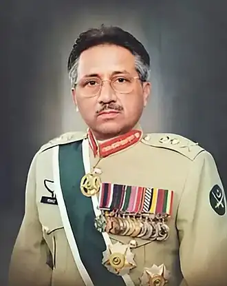 The 1999 military takeover in Pakistan[3] was a bloodless coup d'état initiated by the military staff at the Joint Staff HQ working under the Chairman of the Joint Chiefs of Staff Committee and Chief of Army Staff General Pervez Musharraf. The instigators seized control of the civilian government of the popularly elected Prime Minister Nawaz Sharif on 12 October 1999.[4] On 14 October, General Musharraf, acting as the country's Chief Executive, issued a controversial provisional order that suspended the Constitution of Pakistan.