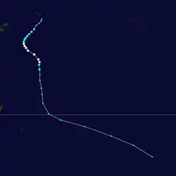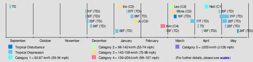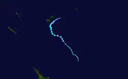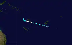 On September 5, a tropical depression had developed in conjunction with a weak tropical wave about 600 km (375 mi) to the south-southeast of Port Vila in Vanuatu.[6] During that day the depression moved slowly towards the southeast, while weakening due to the influence of north-westerly windshear, before the final advisory was issued during September 6.[6] Tropical Disturbance 01F and 02F then developed towards the end of November, but remained weak and did not significantly develop.[7] On December 1, Tropical Depression 03F developed near the Vanuatuan islands, over the next few days the depression remained near stationary before it was last noted on December 3.[8] Tropical Depression 04F developed near New Caledonia on December 5, over the next few days it moved quickly towards the east, before weakening during December 7, while located near the Tongan Islands.[8]