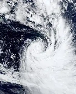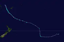 During February 22, a cold core low developed into a tropical depression, about 110 km (70 mi) to the east-southeast of Rikitea in French Polynesia.[2] It initially developed little but late on February 24, the depression developed rapidly, and the storm reached tropical storm strength at 18:00 (UTC), named Tropical Cyclone Kim. It was located about 75 km (47 mi) west of Rikitea or about 125 km (78 mi) southeast of Mururoa. Cyclone Kim reached hurricane strength on February 25, only 18 hours after being named, while moving to the south-west. The storm reached its peak intensity of 80 knots (150 km/h) on February 26 at 12:00 (UTC), located more than 1,295 km (805 mi) east of Tahiti. Minimum pressure at this time was 955 mbar. The estimated 1-min average winds from NPMOC was 100 knots (190 km/h). Kim gradually weakened over cooler waters, still moving to the south-west. Cyclone Kim became extratropical south of Tahiti on February 29 at 06:00 (UTC).