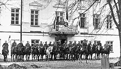 On February 5, Poland signed an agreement with Germany regulating the withdrawal of the German army from western Belarus and giving the Polish army the opportunity to march eastward. On February 14, 1919, Polish troops came into contact with the Bolshevik army near Vawkavysk.[12] The Belarusian authorities, informed by the Germans of the agreement, began to leave Grodno in March 1919. Lithuanian authorities proposed moving the army to Sejny and Suwalki, which the Belarusians rejected. They obtained a loan of 4 million marks from the Ukrainian People's Republic, which gave them some independence.[13] It is possible that at that time the regiment ceased to be maintained from the Lithuanian budget and began to be maintained from Belarusian funds.[14] In early April, German troops began evacuating Grodno. Col. Demidov pulled the 5th company from Kaunas to reinforce his position.[15] On April 16, 1919, the Polish Army launched a wide-ranging offensive against the Bolsheviks from Lida to Vilnius, and entered Grodno.[16] Gen. Wojciech Falewicz took over the command of the Grodno Fortress.[15]