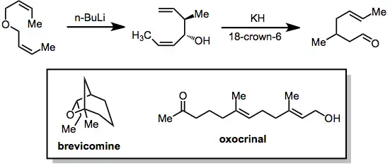 The products of the [2,3]-Wittig rearrangement of bis(allylic) ethers are 1,5-dien-3-ols. These substrates may undergo the oxy-Cope rearrangement upon deprotonation, affording δ,ε-unsaturated carbonyls. This tandem sigmatropic strategy has been employed in the synthesis of some natural products, including brevicomine and oxocrinol.[16]