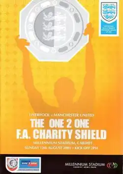 The 2001 FA Charity Shield (also known as The One 2 One FA Charity Shield for sponsorship reasons) was the 79th FA Charity Shield, an annual football match played between the winners of the previous season's Premier League and FA Cup. The match was contested between Liverpool, winners of the 2000–01 FA Cup and Manchester United, who won the 2000–01 Premier League on 12 August 2001. It was the first Shield match to be held at the Millennium Stadium following the closure of Wembley Stadium for reconstruction. It was also the final time that the match was played under the FA Charity Shield name, as it was renamed as the FA Community Shield the following year.[2]