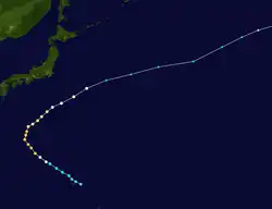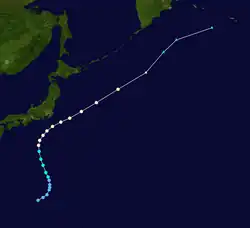 Tropical Depression 09W developed from an area of convection about 1,000 km (620 mi) to the east of Iwo Jima on July 21. Continued consolidation of its convection prompted both the JTWC to classify it as a tropical storm on 18:00 UTC.[27] The JMA followed suit six hours later and named it Kong-rey.[13] By July 23, the JTWC upgraded Kong-rey to a typhoon while the JMA upgraded it to a severe tropical storm.[13][11] A mid-latitude ridge to the east of Japan strengthened, causing Kong-rey to curve and move in a northeastward direction.[27] Kong-rey reached its peak intensity on July 25, then slightly weakened afterwards. At the same time, the JMA had finally upgraded Kong-rey to a typhoon.[13] On July 26, a redevelopment of a small eye caused Kong-rey to reach its second peak intensity for a short period of time. Its peak strength only maxed out to 10-minute sustained winds of 130 km/h (81 mph). Increasing wind shear caused the typhoon to weaken the next day. Kong-rey was downgraded to a tropical storm on 00:00 UTC of July 28.[27] Both agencies issued their final warning later that day when it had become extratropical.[13][11] Its remnants was still tracked until it reached the southwestern Aleutian Islands on August 3.[27]