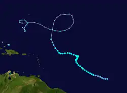 A tropical wave moved westward off the coast of Africa on July 14.[44] After tracking steadily westward, an area of thunderstorms became more concentrated as its upper-level environment became more favorable,[45] and late on July 19 the National Hurricane Center classified it as Tropical Depression Six while it was located about 1,035 miles (1,666 km) east of the Lesser Antilles.[44] Upon being classified as a tropical cyclone, the depression maintained two ill-defined hooking bands to its north and south, and was originally forecast to attain hurricane status before passing through the Lesser Antilles. With warm waters and very light wind shear forecast, its environmental conditions met four out of five parameters for rapid intensification.[46] Subsequently, convection diminished as the result of cold air inflow and instability from a disturbance to its southeast.[47]