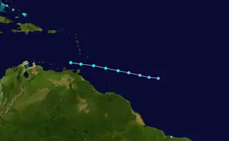 By August 13, a tropical wave developed into Tropical Depression Five while located about 1,150 mi (1,850 km) east of the Lesser Antilles. The depression headed westward between 21 and 29 mph (34 and 47 km/h) due to a strong subtropical ridge located to its north. After developing banding features and an increase in Dvorak intensity estimates, the depression was upgraded to Tropical Storm Earl at 18:00 UTC on August 14. The storm strengthened slightly further and on the following day, it reached maximum sustained winds of 50 mph (80 km/h). Later on August 15, Earl crossed the Windward Islands and passed just south of Grenada.[45]