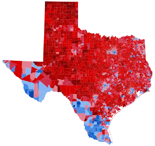 Texas, located in the South, has become a consistently Republican state at all levels. Economically and racially diverse, Texas includes a huge swath of the Bible Belt where many voters, especially those in rural Texas, identify as born-again or evangelical Christians and therefore tend to vote Republican due to the party's opposition to abortion. Although once part of the Solid South, the last time Texas voted for a Democratic presidential nominee was Jimmy Carter in 1976.[10] George Bush achieved his party's best result in Texas since Ronald Reagan's second landslide in 1984.