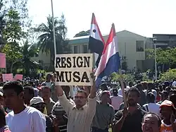 On January 14, 2005 Said Musa's administration announced its budget for 2005-2006.[1] The budget included major tax increases on a variety of businesses and commodities. It included an 11% increase in the real estate sales tax, a five percent tax increase for financial institutions, an eight percent tax increase on tobacco, and a 100% tax increase on rum. The government claims that these tax increases were comparable to increases instituted in 1998 under the United Democratic Party (UDP). However, after years of popular frustration at alleged financial mismanagement and corruption by the People's United Party (PUP), the new budget sparked condemnation from local interest groups[2] and protests at the National Assembly building on January 14, with demonstrations continued throughout the following week. The main protesters were the National Trade Union Congress of Belize and the Belize Chamber of Commerce.