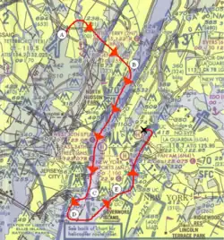 The aircraft's Ballistic Recovery Systems emergency parachute, designed to bring the small plane down safely from altitudes above 500 ft, was not deployed.[22] The plane circled the Statue of Liberty before flying north up the East River and disappeared from radar near the Queensboro Bridge. It was flying under visual flight rules (VFR) and had attracted no special attention from air traffic controllers or NORAD before the crash. The aircraft took a hard U-shaped turn before it hit the building.[21]