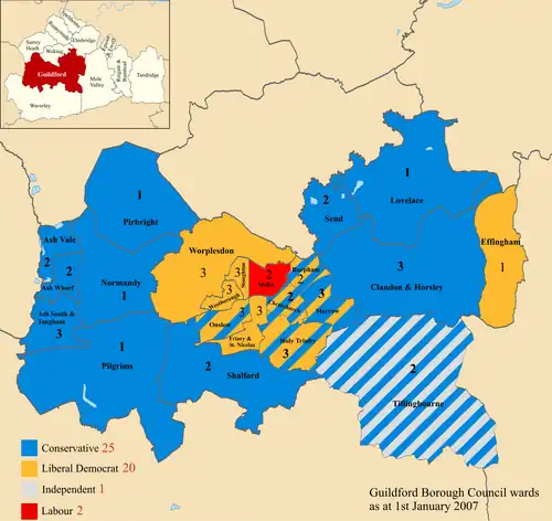 Going into the 2007 council election the net position was as follows.[1] (The net position shown includes the gain by the Liberal Democrats of one seat from the Conservatives during the 2003–07 term, in the Merrow by-election of July 2003.)