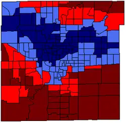 Voting by party by neighborhood. The darkest blue shade represents more than 60% of votes were for Peterson, the lighter blue shade represents more than 50% for Peterson. The darkest red shade represents more than 60% of votes were for Ballard, the lighter red shade represents more than 50% for Ballard.